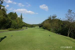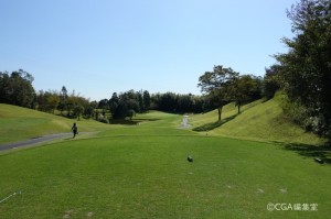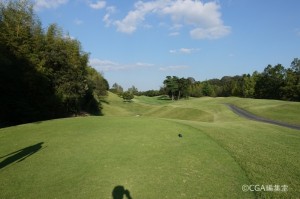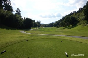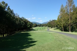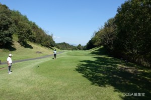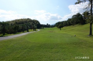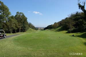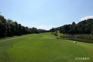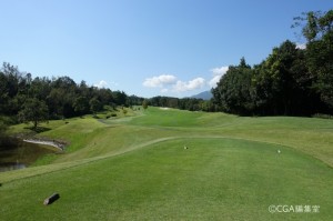 御在所を遠くに望み、緩やかに左にドッグレッグのロングホール。第1打、フェアウェイが右に傾斜していて下はOBゾーン、左カート道の下にはクリークが待ち受ける。狙い目は一本木の右側。フェアウェイ右のOBゾーンはグリーン横まで続いているため、第2打は左目方向が安全。ロングだが、バーディホールにはなりにくい。