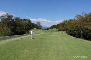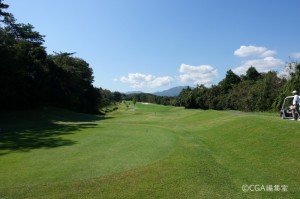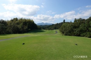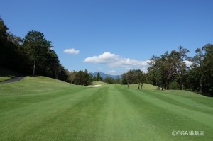 正面に見えるグリーンまで軽い上りが続くミドル。遠く御在所岳が望める絶景ホールでもある。第1打は左に落とすと、下からフェアウェイに戻さなければいけないので避けたい。狙い目はやや右寄り。