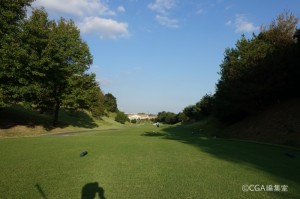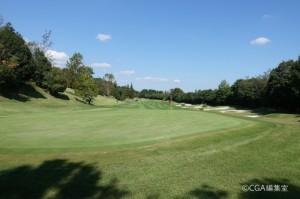 軽く右へ曲がっていくパー4。第1打は右の林はOBなので、左からの攻めが鉄則。とはいえ、思い切ってショットしたいホールでもある。グリーンは2段になっていて傾斜もきついので、難しい。