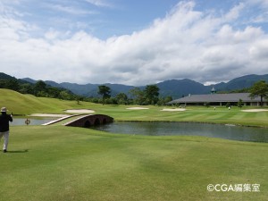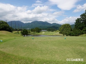 正面にクラブハウス、奥には鈴鹿山脈、景観の美しいライオンズ名物のロングホール。ティーイングエリア前とグリーン手前に大きな池がある。手堅く刻むか豪快に2オンを狙うか考えさせられる。