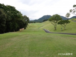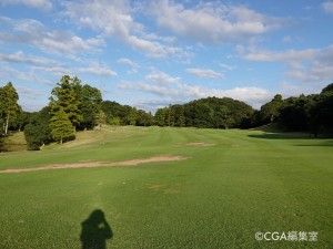 大きく右にドッグレッグするパー5。ティーイングエリアからはグリーンは見えない。左はOBゾーン。狙い目はカート道のある右サイドになる。風は右から左方向、またはアゲンストのことが多い。飛距離自慢は右の斜面を大胆に狙うのもドッグレッグの向こうのフェアウェイもあり得る。