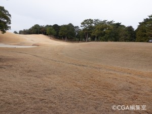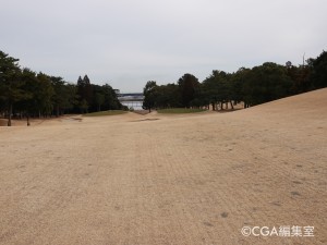 2打目からは打ち下ろしになる。競技時に使用する右のグリーンは砲台、しかも台形状になっているため、お悔やみ義は禁物。ピンに寄せるのがとても難しい。手前の花道から攻めることが鉄則となる。