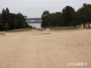 2打目からは打ち下ろしになる。競技時に使用する右のグリーンは砲台、しかも台形状になっているため、お悔やみ義は禁物。ピンに寄せるのがとても難しい。手前の花道から攻めることが鉄則となる。